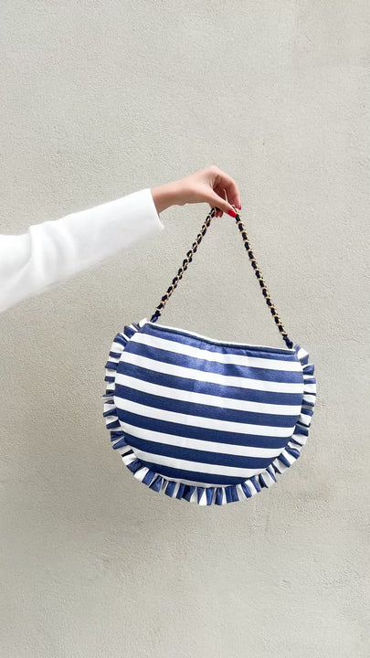 - Bolso confecionado en un tejido de rayas blancas y azul de lurex.