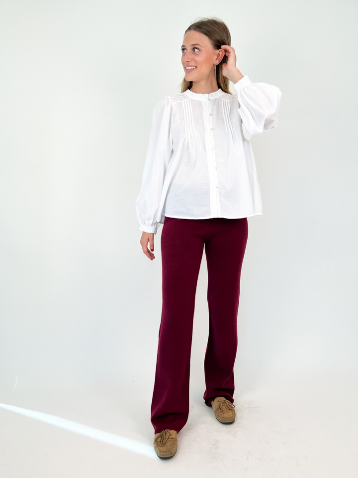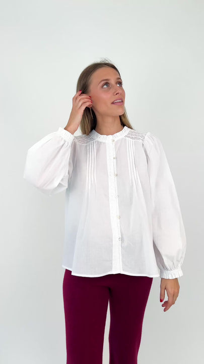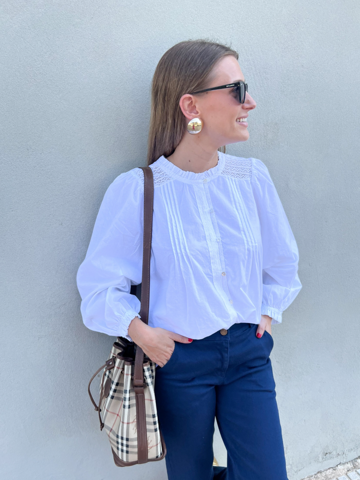 - Camisa blanca confeccionada en un tejido de algodón con detalles de entredoses, jaretas y puntillas.
