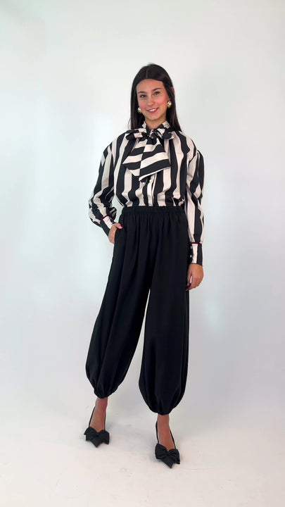 - Camisa confeccionada en un tejido de rayas negro y crudo.