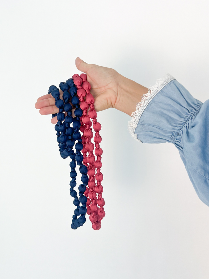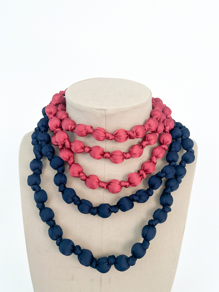 - Collar de bolas, confeccionado en un tejido satén en un tono rosado/burdeos.