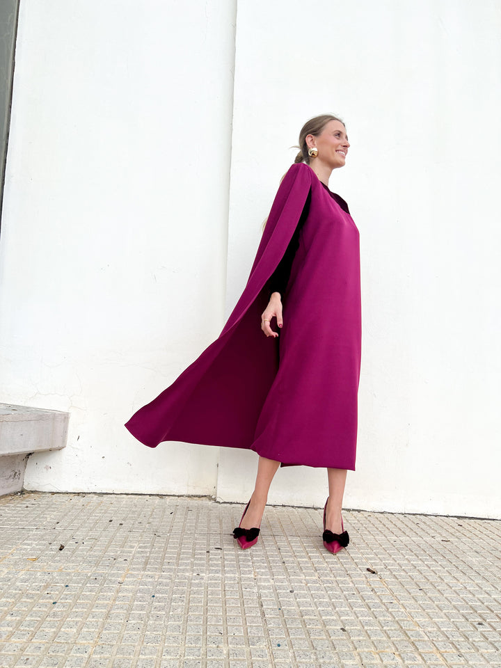 - Diseño asimétrico con capa, cuello a la caja, botón posterior y cremallera lateral.
