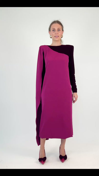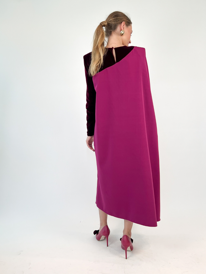 - Vestido confeccionado en un tejido de crepe frambuesa y terciopelo combinado.