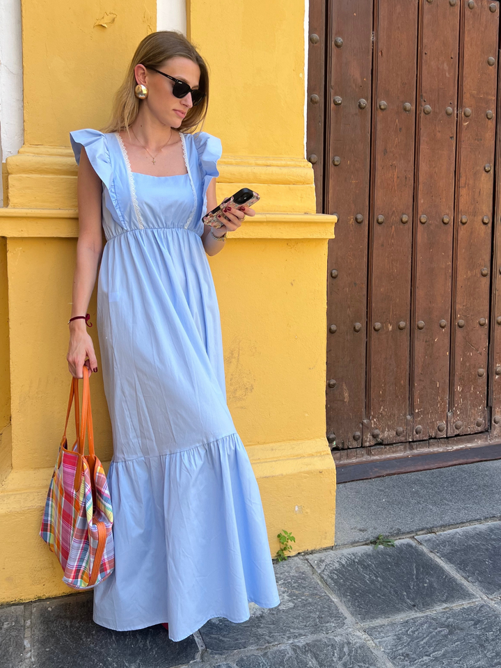 - Escote cuadrado delantero con detalles de encajito blanco.
